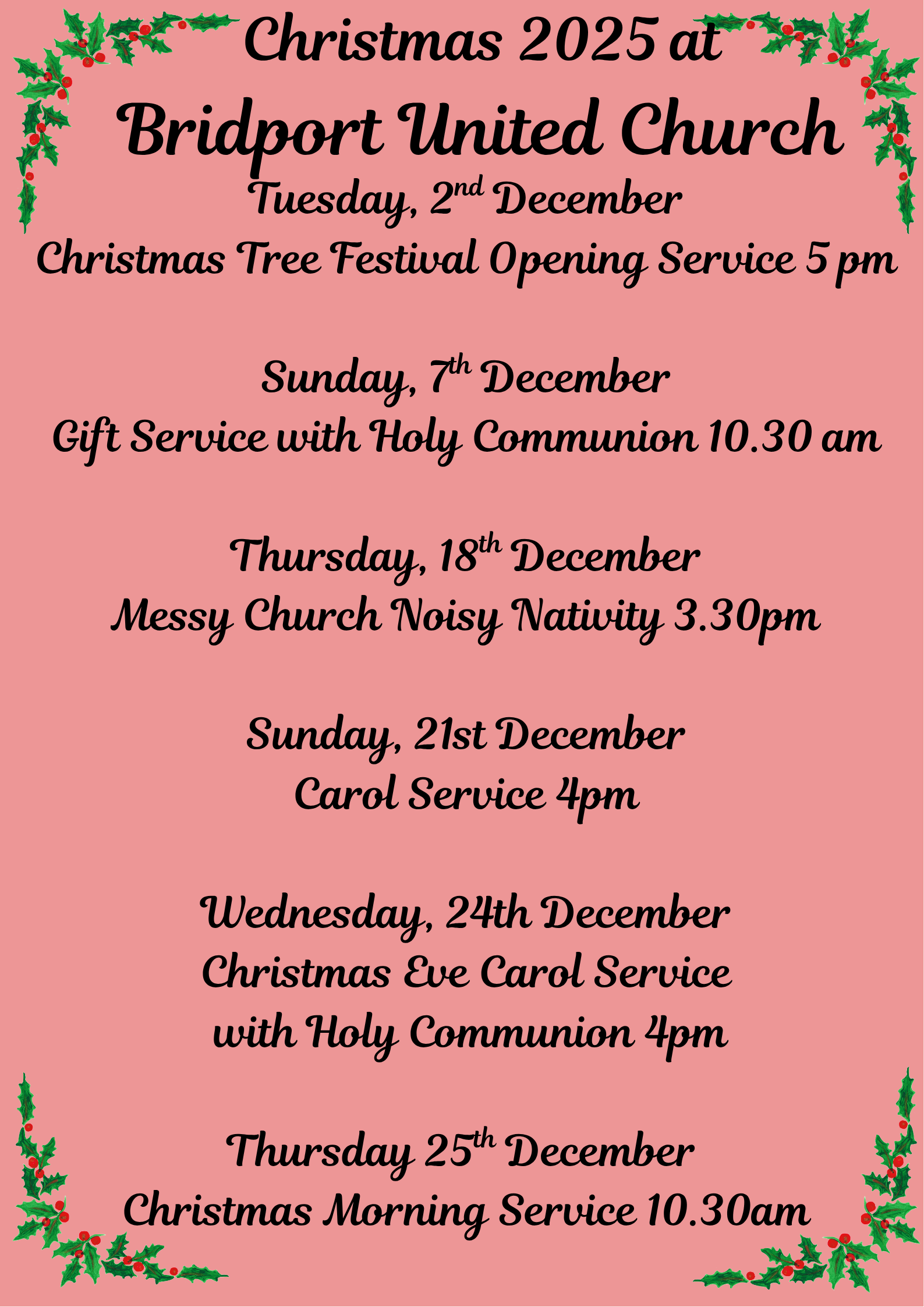 Our church building dates from 1860 and was originally a congregational church (which later became the URC), but in 1972 the Bridport URC and Methodist churches came together to form Bridport United Church - we celebrated our 50th birthday in 2022!